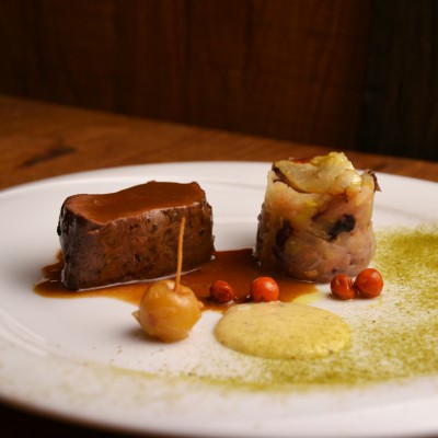 Pire in čips pečenega jabolka, crumble z makom, biskvit orehov, mousse skute, karamelizirani orehi