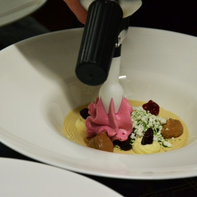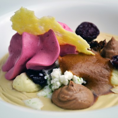 Pita s panakoto rdeče pese, moussom malin in moussom bele čokolade